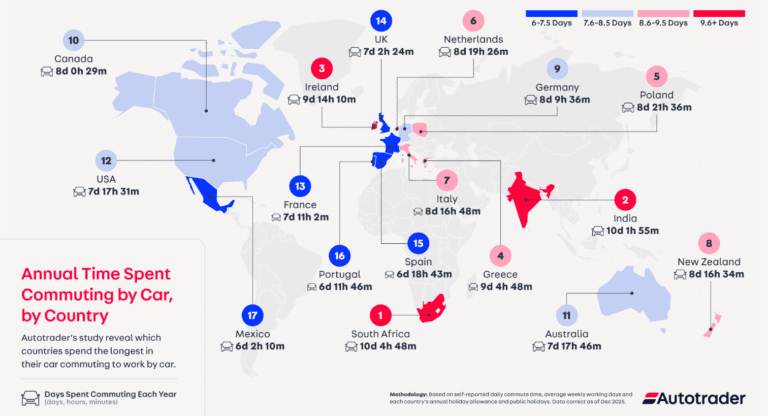 With office attendance hitting its highest levels since the pandemic, the commute was back on everyone’s radar. Rather than rehashing familiar rush-hour stats, we looked at how much time drivers actually spend in their cars each year once hybrid schedules, public holidays and annual leave are factored in. We mapped the findings globally, revealing the countries where car commuters clock up the most and least time on the road.