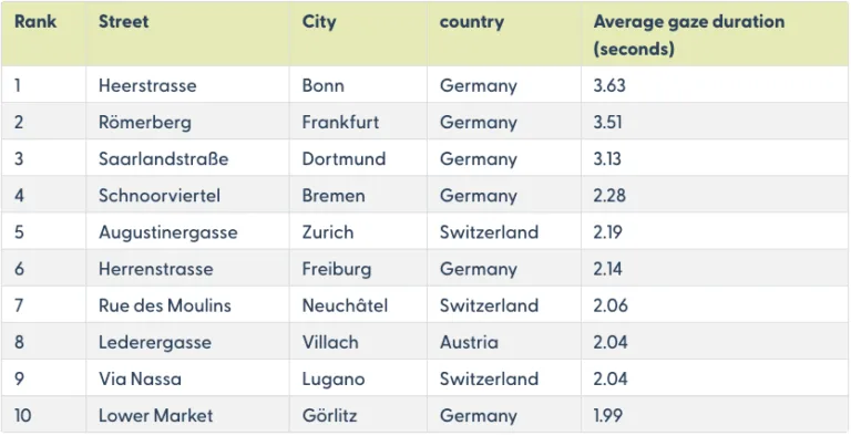 Building on our backlink strategy in the DACH region, we turned to eye-tracking technology to find the most picturesque streets across German-speaking Europe. The study analysed which scenic streets from over 50 locations in Germany, Austria and Switzerland garnered the most attention from 500 participants. The study revealed Lederergasse, Augustinergasse and Frankfurt’s Brückenstraße as the crowd favourites.